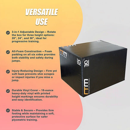Each Jump Box features foam on all six sidesmaking these boxes firm and secure enough to perform challenging plyometric movements, but soft enough that you won't scrape your shins on the edges if you misstep. The box can also be quickly positioned at three different height settings20, 24, and 30. An 18-ounce vinyl is included with printed indications of which height you're using during your workout. The varying heights also make this 3 In 1 Games Box suitable for multiple fitness levels.