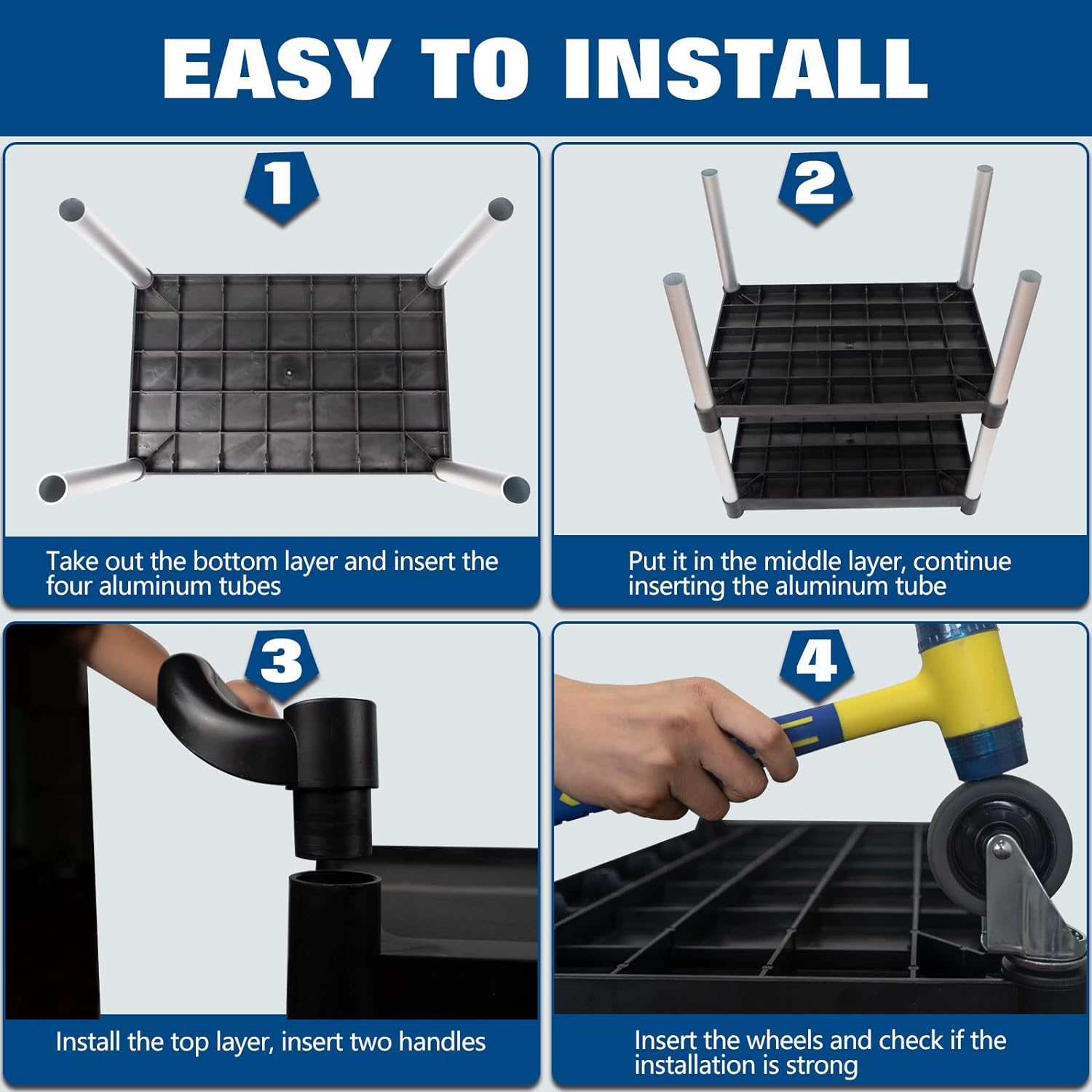 These durable and attractive carts work for front and back-of-house applications. Large shelves hold a variety of equipment and supplies. Smooth surfaces make the cart easy to clean. Molded shelves will not rust, dent or require painting. Brushed aluminum uprights are engineered for durability and appearance. Plastic construction minimizes noise. Large non-marking 4" swivel casters reduce touch-up cleaning. Convenient handles located on each end and compact size enhances maneuverability. Carries up to a 240KG.