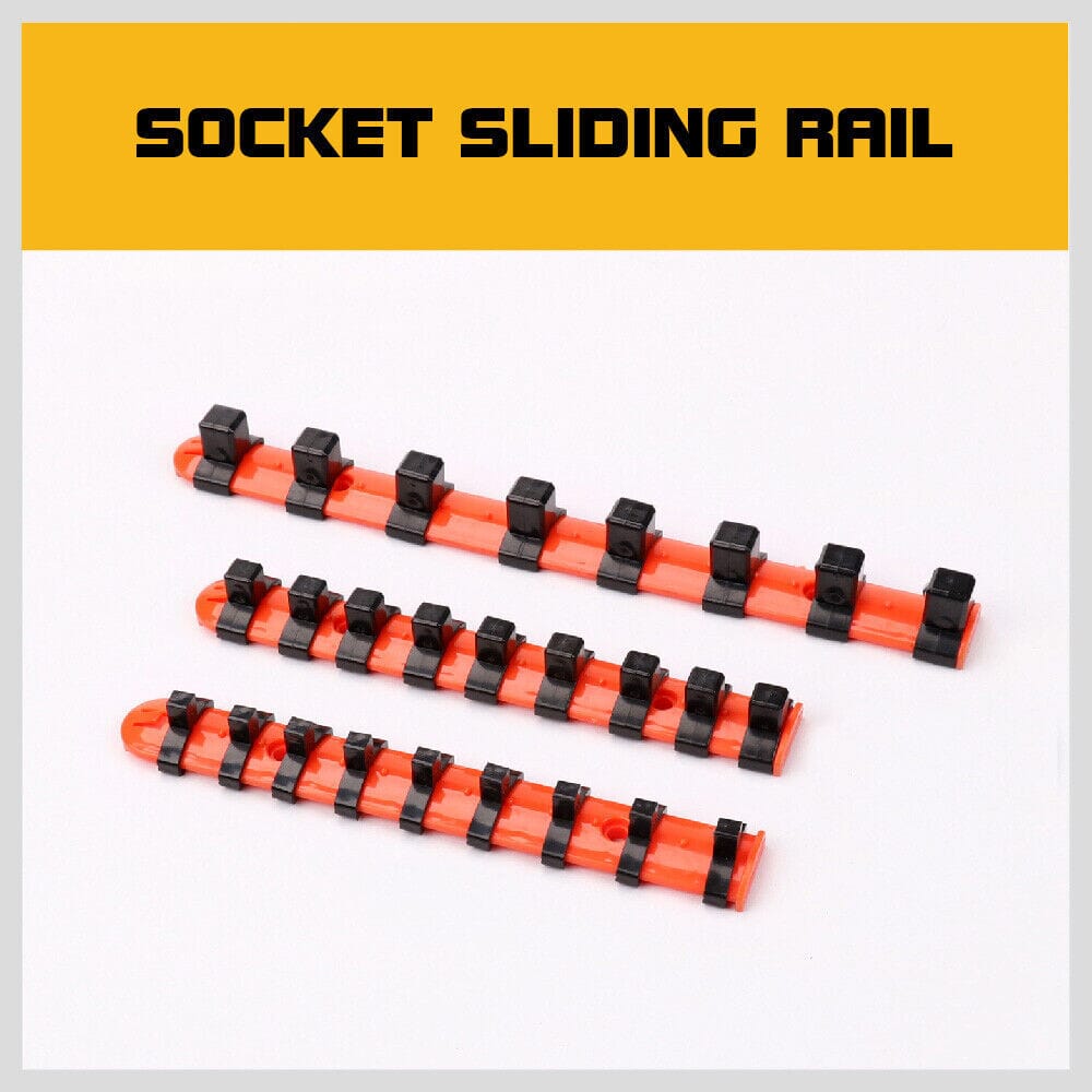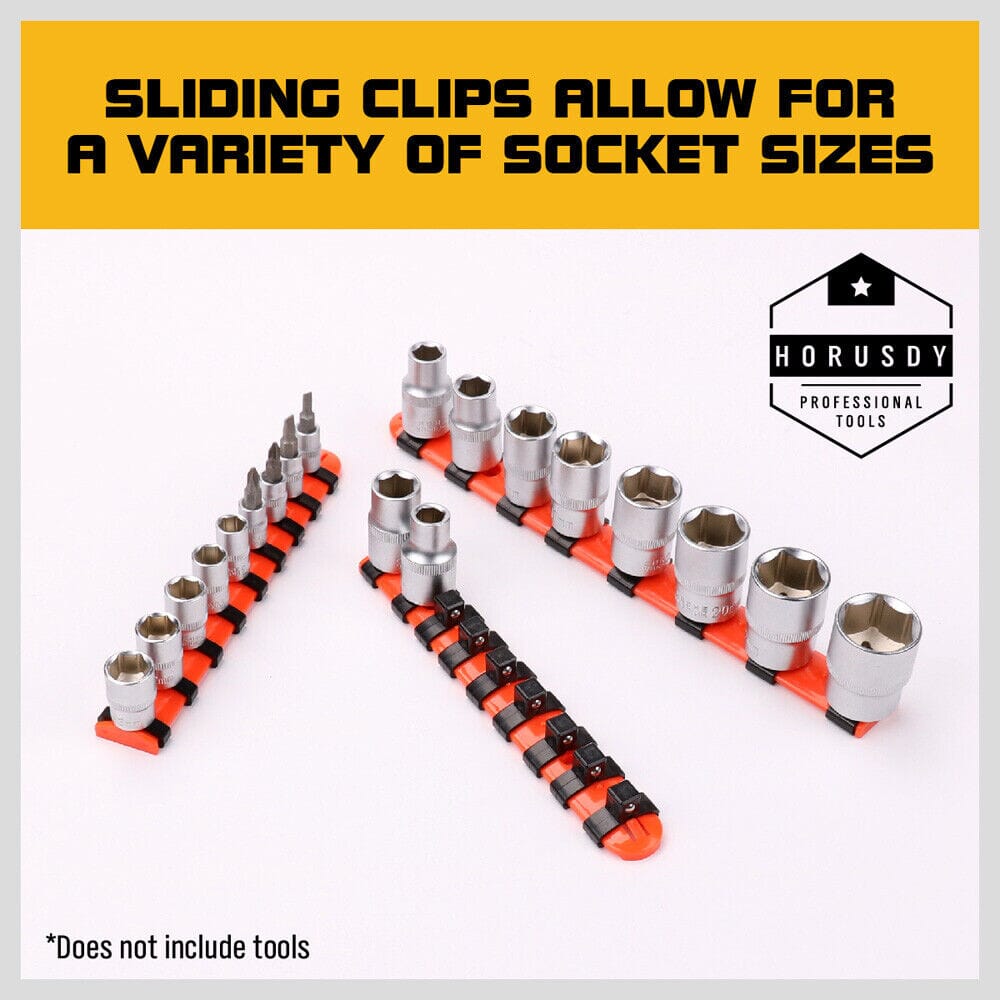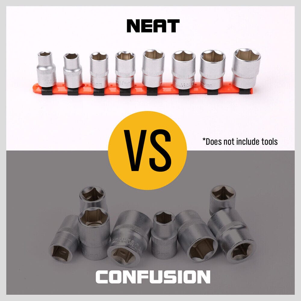 Designed for 1/2" 3/8" and 1/4" socketsAllows you to organize all your square drive sockets by pressing them onto the spring steel socket clipsSpring Loaded Ball Bearings On Each Clip Hold SocketsStore up to 26 socketsSocket clips will adjust to any positionSPECIFICATIONS
