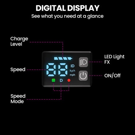 - DIGITAL DASH - See speed, mode, and battery level at a glance