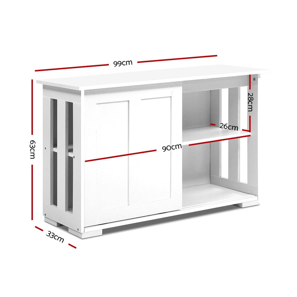 Our charming Artiss Buffet Sideboard is a counter, cabinet and storage space all rolled into one. And that makes it simply indispensable in your household, particularly when you need all the help you can get with hosting dinners and preparing great meals. The sideboard comprises a countertop and two large shelves within a two-door cabinet. Surely, more than enough space to hold a variety of kitchen and household essentials comfortably. The sliding doors open and close smoothly and the slatted side panels look stylish while also provide great air flow so that you can have fresh smelling tea towels instead of musty smelling ones. The entire ensemble is finished in smooth, white paper veneer and constructed with quality particle board for solid construction. Not least, the sturdy base and five floor protectors ensure that all items are kept securely in place while keeping your floor pristine.