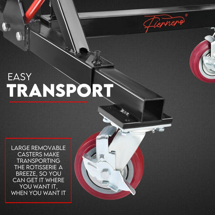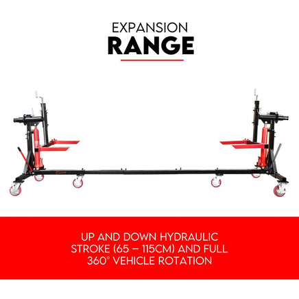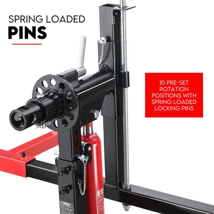 This 2000 lb. capacity rotisserie is a cost-effective solution that keeps your work smart. It features dual hydraulic cylinders that lift the lifting framework to the desired working height for those unreachable areas. In addition, it has a resistant powder coat finish to prevent rust and four locking casters from keeping your rotisserie stable while you work.