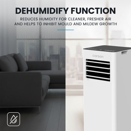 Stay cool and in control with the Carson PA220 Portable Air Conditioner - your compact solution for fast, efficient and quiet cooling. Just sit back, relax, and use the remote control to adjust the temperature from the comfort of your lounge. With a 2.05 kW (7000 BTU) output, it keeps rooms up to 20 sqm comfortable, perfect for home offices, bedrooms, or studios.