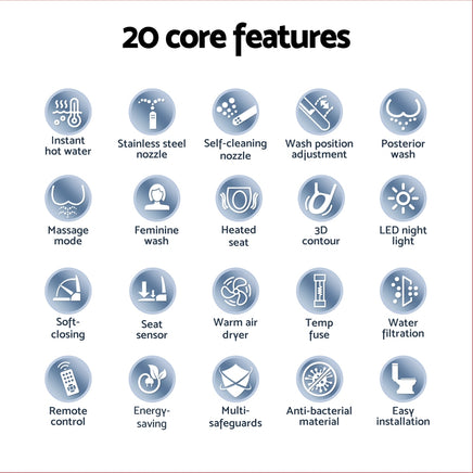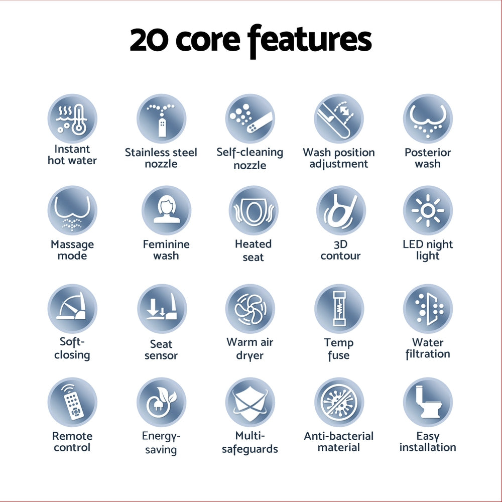 Transform your bathroom into a sanctuary of cleanliness comfort with the Cefito Smart Bidet Toilet Seat. This electronic bidet boasts IPX4 waterproofing and a user-friendly one-knob with adjustable water temperature (up to 40??) and spray intensity. Key features include a self-cleaning stainless steel nozzle, LED night light, and automatic deodorisation. Experience luxury with a heated seat (up to 40??) and warm air dryer. Designed for energy-saving, this Bidet Toilet Seat includes water-filtering and multi-safeguards for peace of mind. Its slow-closing lid adds quiet convenience to your toilet bidet experience.