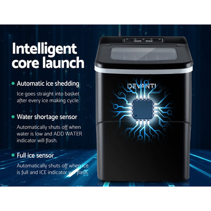 Looking for ice in a hurry? Meet our Devanti Ice Maker! Quickly produce 9 ice cubes in 6-13 minutes, with the flexibility to choose from 2 sizes. It's loaded with smart features like water shortage and ice full alarms, plus energy-saving technology through Freon-free refrigerant and enhanced heat dissipation. Its sleek, compact design fits anywhere, and with its easy-to-use controls, youll be enjoying cold beverages in no time. Ice at home has never been cooler!