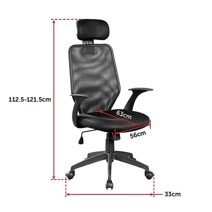 The chair is constructed with a black mesh for superior comfort which conforms to your back and spinal column, giving you the energy and proper support to power through the day. A dedicated headrest is perfect for leaning back and taking a little break. A convenient gaslift makes height easily adjustable from 118.5cm to 128.5cm. And a nylon base with 5 castor wheels provide an easy way to rotate and wheel around.