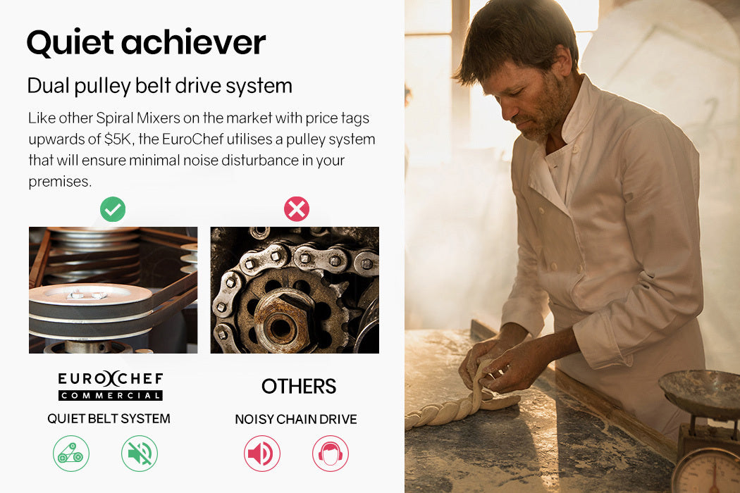 Eurochef Spiral mixers are ideal for business owners who recognise the importance of quality and reliability for increasing production and maximising profits. The EuroChef Commercial range is offered directly at wholesale prices, making this spiral dough mixer a smart investment for savvy owners of bakeries and pizzerias.