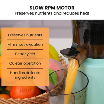 - Slow juicing at 55 RPM for maximum nutrition