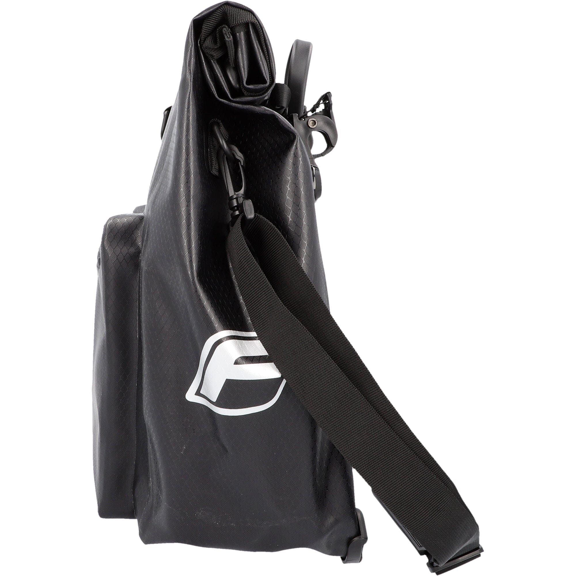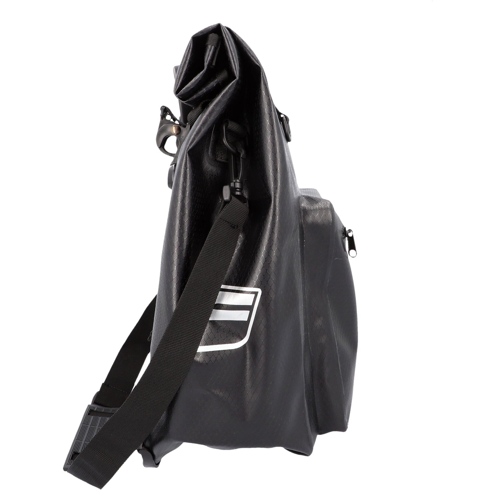 Reflex logo prints on bo h sides increase your own visibility. The bicycle bag. which weighs approx. 1200 grams. can be at ached to he luggage rack without tools using the click system and can also be easily removed again by pulling on the carrying handle.