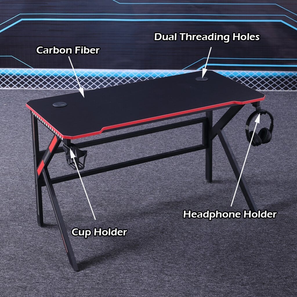 Our Gaming Desk features a spacious tabletop for ultimate gaming gear. Carbon fiber surface features with a smooth and gorgeous texture. The ergonomically contoured desktop allows a closer distance to the gaming screen. With its K-shaped legs, it provides an extremely steady construction which has a 100kg high bearing capacity. Moreover, reinforced braces, round edges, and floor protector to enhance its premium quality details. Get your game on with our stylish gaming desk.