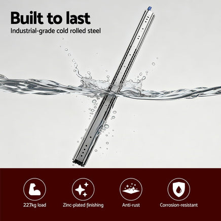 The Giantz Heavy Duty Drawer Slides come as a pair, measuring 76mm in width and 19.5mm in thickness, with a full extension range from 1321mm to 2642mm. The three-section ball bearing design ensures smooth and quiet sliding.The secure lock-in and lock-out mechanism keeps drawers safely fixed in the fully closed or fully extended position, preventing accidental overextension or detachment from the tracks. Crafted from robust cold rolled steel with a corrosion-resistant zinc plated finish, these slides support up to 227kg load capacity, providing reliable strength for heavy storage.Ideal for large drawers, cabinets, industrial storage, vehicle fit-outs, and multimedia equipment, these slides are versatile and built to last. Each set includes two slides, 12 x M5 screws, and 12 x M5 screw nuts as a bonus for easy installation.
