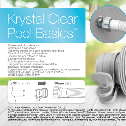 Intex Krystal Clear Adapter 'B' 38mm to 32mmAs the warm weather starts to continue long into the night, you may notice that the water flow in your above-ground pool is down, and the water is not as sparkling clear as it used to be. If your pump and filter system just isn't functioning up to par, it's time to upgrade to one that features higher quality and more bandwidth. When you decide to make the switch, you'll need to have these Intex Replacement Hose Adapters on hand to make the replacement process go smoothly. As a genuine Intex OEM replacement part, you can be sure that these adaptors will keep your pump working properly and efficiently all while keeping your pool safe. You may be thinking of upgrading from your existing Intex 530 GPH or 1,000 GPH filter pump to the Intex 1,500 GPH or even a larger system, and these adaptors will ensure that your new pump and filter system is working as it should. By reducing the pump's 38mm screw-on hoses on these large filters down to a 32mm on the pool inlet and outlet ports, you can make sure that the water is flowing through your systems correctly. These B-series adapters can stand up to the rigor of your pool use thanks to their strong, heavy-duty plastic body. Rest easy knowing that they are crack and leak-resistant so you don't have to keep replacing them every few months. Whether you are trying to adapt previous generation equipment with new liners, or you just want to upgrade your pool filtration system for even cleaner and crystal-clear water, these Replacement Hose Adapters will come in handy.