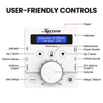 Unleash your inner drummer with the Karrera X23 Electronic Drum Kit. With five precision-engineered drums (including snare, bass and three toms), three responsive cymbals (crash, ride, hi-hat), and ultra-sensitive bass and hi-hat pedals, youll command an authentic drumming experience.