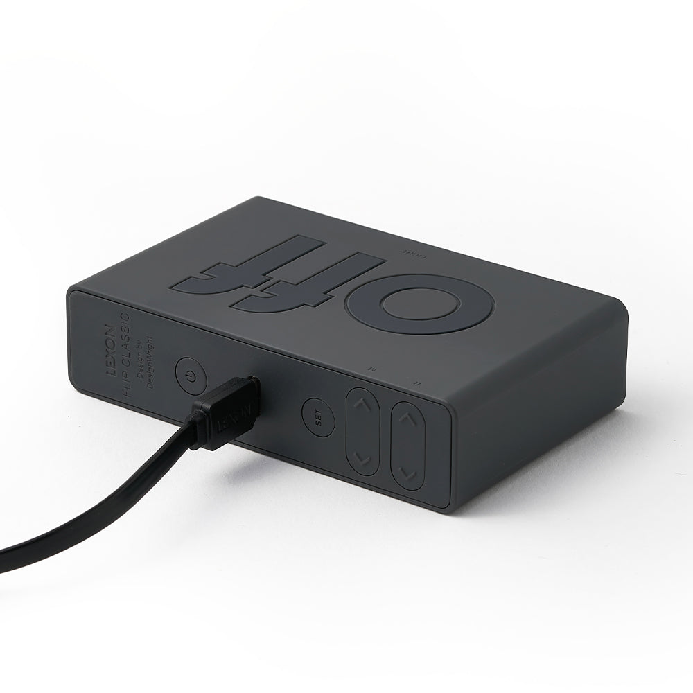 Lexon Flip Classic Reversible Alarm Clock - Grey - Fun and equipped with two faces (ON / OFF), the alarm clock must be turned down to be activated or deactivated with a simple gesture. Thanks to its integrated touch control, you just have to touch it to trigger the light of its LCD display. In addition, Flip Classic features some discreet buttons on its back to set the time/date format, alarm and screen brightness. Designed to be your ultimate bedside companion, Flip Classic boasts a 6-month battery life, rechargeable via USB-C. A battery indicator is visible on screen so you’ll easily know when to recharge your device.