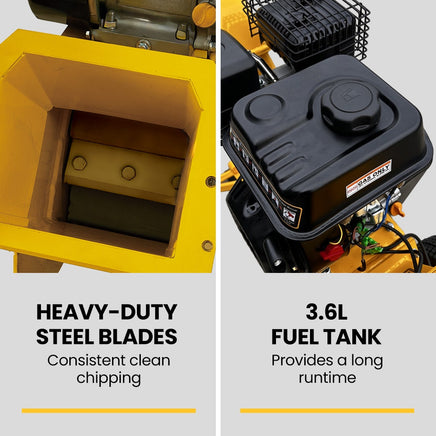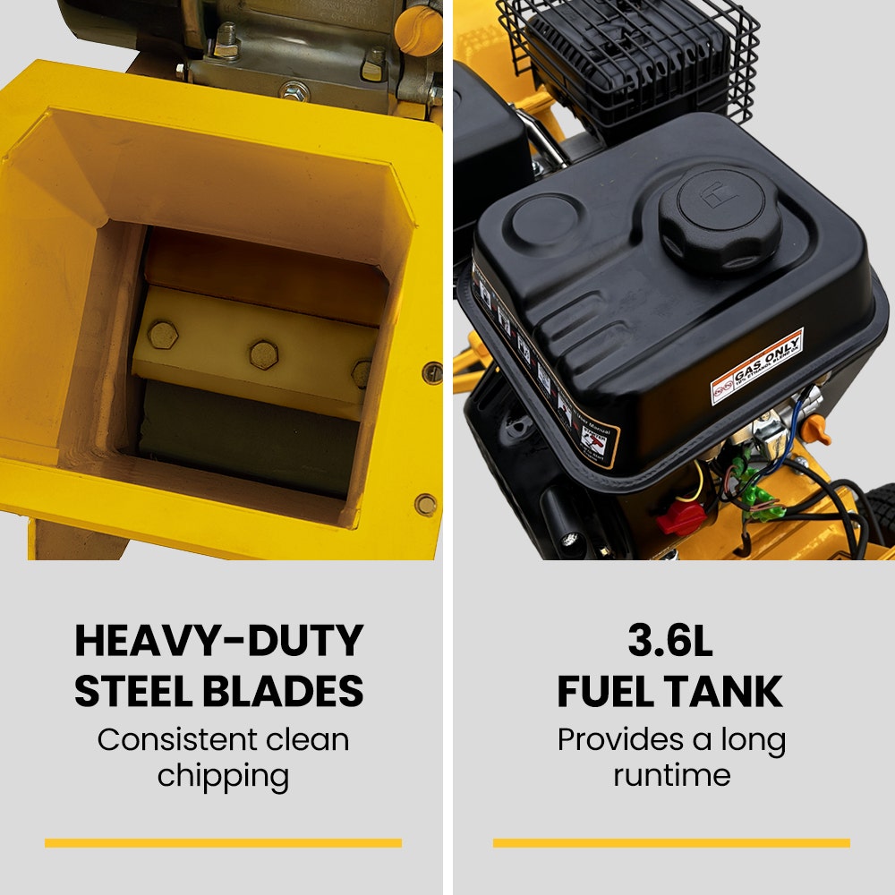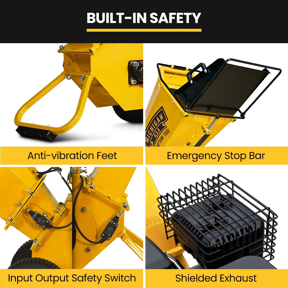 The Michigan Raptor 1100 Wood Chipper is built for homeowners and professionals who want dependable power for tough yard work. With a 212cc 7HP engine, it chews through branches up to 50mm thick, turning bulky waste into neat, manageable chips. Its heavy-duty steel construction and twin V-belt drive deliver long-lasting reliability, while the low-oil shutdown and emergency stop bar provide added peace of mind. Designed for easy maneuvering and smooth operation, the Raptor 1100 is a tough, no-nonsense performer that makes light work of property maintenance and clean-ups.