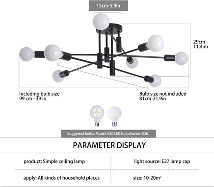 • This modern Sputnik chandelier offers 8 multi-directional lamp bases, 4 same length rods, and 4 adjustable arms that can be rotated to your desired angle. With a diameter of 31.9in/81cm and a fixture height of 29cm, this chandelier is sure to make a statement in any room. Plus, the 5.9in/15cm canopy ensures easy installation.