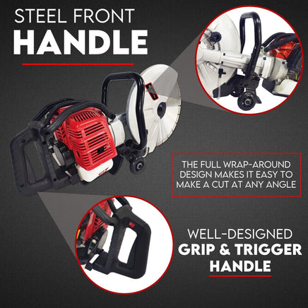 The 75cc saw can easily cut through some of the most tough materials: brick, concrete, stone, paving, asphalt, etc. In addition, the ergonomic grip ensures you have complete control of the cut-off saw while you are using it.