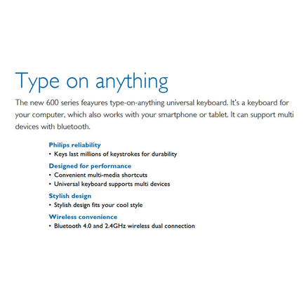 This Philips Wireless Compact Keyboard is a great way to do your work anywhere with any device.