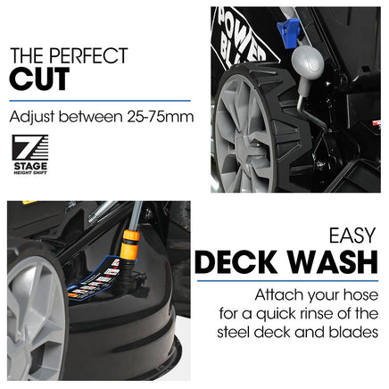 The durable steel deck features 7 adjustable height positions, ranging from 25mm to 75mm, allowing you to achieve the perfect cut every time. The versatile VS900 offers three cutting options: