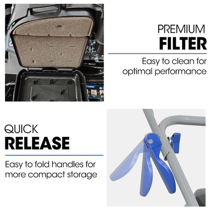 Navigate any terrain smoothly with oversized wheels and premium bearings, while the heavy-duty quad swing blade system ensures a precise 20-inch cut. The swing blades are designed to protect the shaft in the event of a solid object being hit. The generous 60L catcher means fewer stops and more continuous mowing.