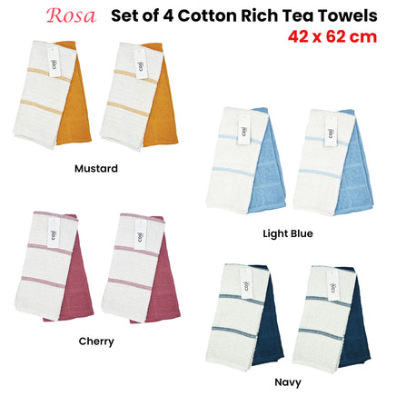 This Set of 4 Rosa Cotton Rich Terry Tea Towels is the perfect addition to your kitchen. These tea towels are ideal for cleaning spills and drying dishes. It features terry design in soft colour tones that will complement any kitchen decor, adding a touch of elegance to your home. Made from quality and easy-care Polyester Cotton fabric for long lasting use.