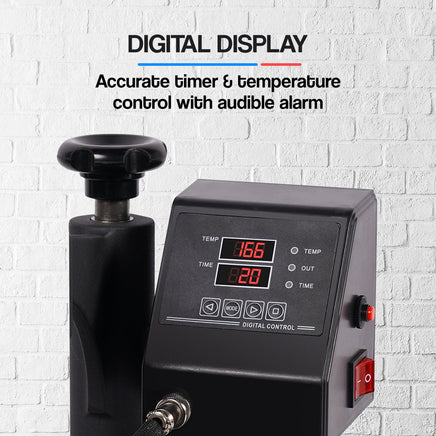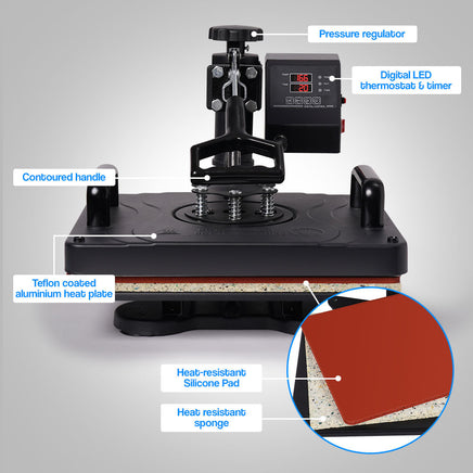 Helping you get the best results every time is a premium non-stick teflon coated aluminium plate with a 1250W double-tube heating element and thick heat resistant silicone padding, for superior performance and even heat distribution. This premium heat press machine is equipped with an accurate digital control panel that allows you to precisely set the temperature and time as required, an alarm will sound to notify you when the job is complete. The printing pressure can be easily set according to the thickness of your transfer material with the adjustment knob.