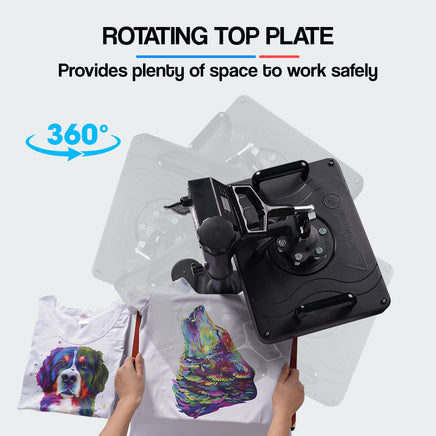 With the handy included accessories you can also perfectly print on mugs, caps, plates and more! Thanks to easy operation you can print as many as 40 items in an hour! The swing-away design of the top plate which rotates 360° provides you with plenty of space to work safely and efficiently.