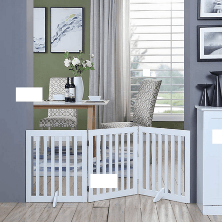 Please note: To ensure adequate stability, we recommend this Dog Gate be installed in a "Z" formation and not a straight line. Sandbags or gripping pads beneath feet may be required to prevent movement by pets. For indoor use only.