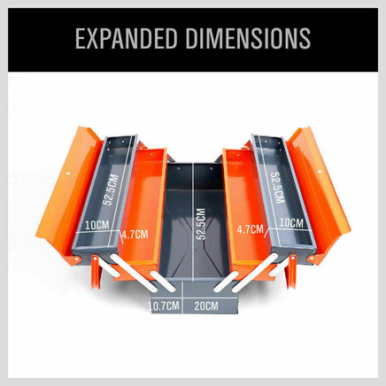 handles, one on each side for additional strength. This two handle design also means there's no risk of the toolbox accidentally opening when carried. The handles can be used for expanding the trays (single handle toolboxes don't have this feature). The lid form incorporates provision for a padlock. Rolled edges on top of each tray for safety. Plenty of storage for small and large tools. Ideal for tradesmen and mechanics.