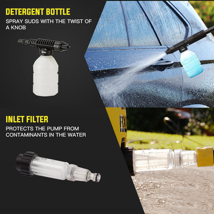 Youll receive a class leading three bonus attachments, a Vari-Nozzle, Inlet Filter as well as a Detergent Bottle, so you can spray suds and then rinse immediately after with the twist of a knob! With this arsenal of attachments you will be able to specifically tackle the most stubborn of grime! Who said cleaning was a chore?