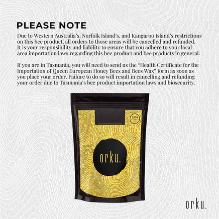 Due toWestern Australias,Norfolk Islands, andKangaroo Islandsrestrictions on this bee product, all orders to those areas will be cancelled and refunded.
