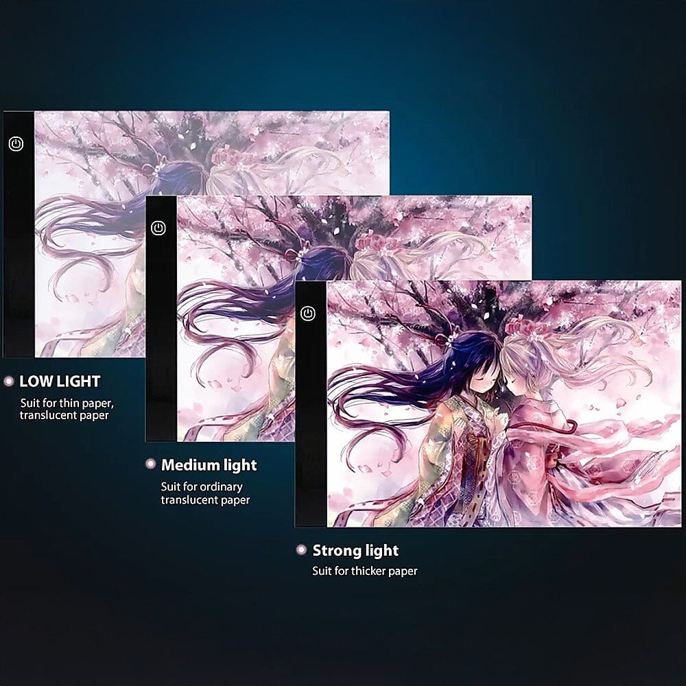 It's the perfect solution to transfer an existing design to fabric or other craft projects, or to duplicate a design for custom tattoos. Its LED backlight can illuminate through even thick paper. Stepless dimming allows you to adjust the brightness to the level you need. Flash film evens the light source to protect your eyesight. This tracing board makes the ideal gift for the artist in your life, as well as a source of inspiration for your own artistic side. Order yours today!