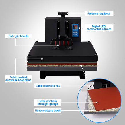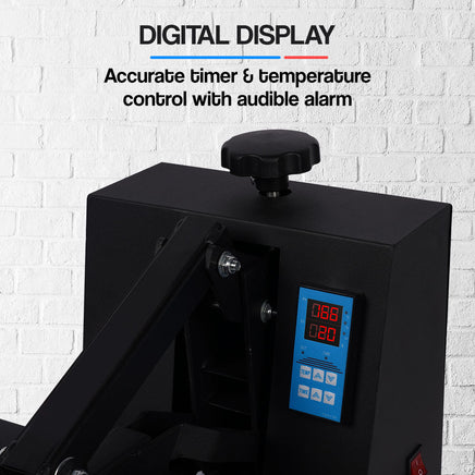 This premium heat press machine is equipped with an accurate digital control panel that allows you to precisely set the temperature and time as required, an alarm will sound to notify you when the job is complete. The printing pressure can be easily set according to the thickness of your transfer material with the adjustment knob.