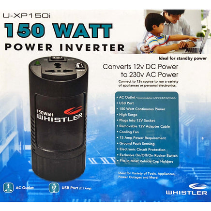 This Whistler can size Inverter with 150W capacity is perfect for powering and charging your electronic devices while driving.