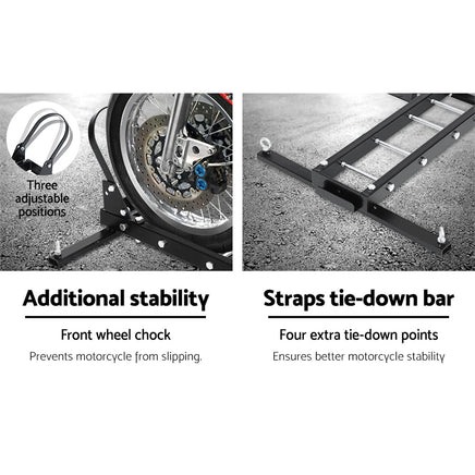 Transport your motorcycle with confidence with the Giantz Motorcycle Carrier. With its 2'' hitch mount, the carrier is compatible with most hitch receivers. Featuring heavy-duty steel construction, the carrier can carry up to 227kg (500lbs) with minimum hassle. It is also designed to enable steady and firm transport with a close-fitting front tyre channel and front wheel chock. The front wheel chock can be adjusted with three available positions. It also comes with four extra tie-down points to better hold the motorcycle firmly in place while on the move. The loading ramp also enables easy up and down and be used either side. Not least, the carrier can also be used for cars with their tyres backed up onto the carrier.