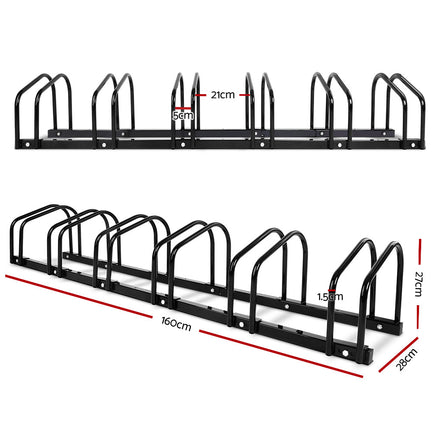 The bike parking rack can securely store up to six bikes side by side and is entirely freestanding. Additionally, the stand can be reconfigured into any vairation of 6 and can be installed in numerous locations. The bike rack is constructed with high quality powder coated steel with a smooth finish to prevent scratches.