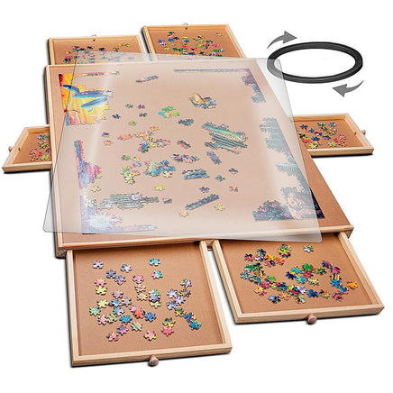 Take your puzzle-solving to the next level with the 1500 Piece Rotating Wooden Jigsaw Puzzle Table designed for comfort, convenience, and serious puzzlers. Featuring a smooth 360 rotating board, you'll enjoy effortless access to every angle of your puzzle without the need for stretching or shifting pieces.