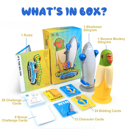 Get ready for laughter, surprises, and friendly competition with Banana Monkey vs Sharkman, the hilarious flip-and-toss action game that brings everyone together! This fast-paced, interactive tabletop game pits two quirky charactersBanana Monkey and Sharkmanin an epic showdown of balance, timing, and luck. Players take turns flipping their character figure into the air using a flick of the wrist, aiming to land it upright on its base. Each successful flip earns points based on challenge cards drawn from the deck, which include fun tasks like single flips, non-dominant hand tosses, or full rotations. With 29 challenge cards, 24 bidding cards, 12 character cards, and 5 bonus cards, every round is packed with variety and excitement. The game supports team play, making it ideal for family game nights, birthday parties, college gatherings, or even as a drinking game at adult events. Its vibrant design, playful theme, and easy-to-learn rules ensure instant engagement across ages. Whether you're cheering on your team or trying to beat the odds, this game delivers endless fun, suspense, and unforgettable moments. It's not just a gameits a party starter!