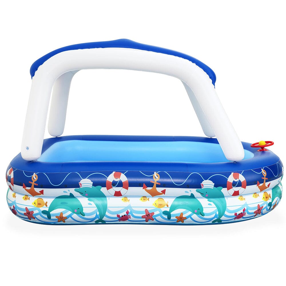 The Bestway® Sea Captain Family Pool is the perfect way for families to play in the water together! While they play, the UV Careful™ canopy will keep them cool and have more safe fun in the sun. Plus, the canopy is removable, giving you the convenient option to remove it and use the pool without it. The sturdy pre-tested vinyl construction also makes the Sea Captain durable while the 3-ply side design ensures that it stands up to robust play with the young ones. Better still, the Sea Captain pool has a built-in steering wheel with a horn that allows kids to pretend they are the captain of the ship as the navigate the wild waters of the sea and honk at the other boats passing by. Set sail on summer fun and let their imaginations run wild as they play under the shade of this family pool. Not least, an emergency repair kit is also included for fast patch-ups.