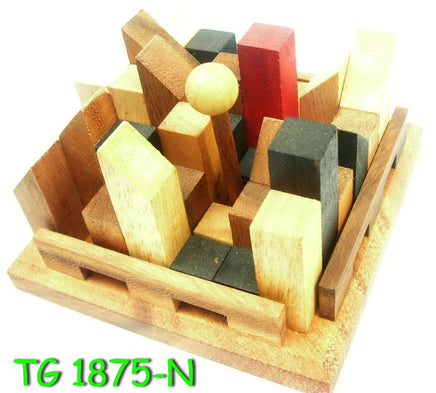 The object : 13 different puzzles in one. Place the dowel pin into any of the holes in the base and then build the city around it. Each hole demands a different and unique placement of the pieces to solve the puzzle.