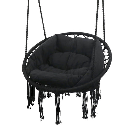 The Hammock Chair Swing with a generously sized 63cm seat cushion provides you with maximum comfort as you lean back and enjoy its gentle sway. Crafted with soft black polyester cotton fabric, it features soft cushioning and a supportive 44cm backrest for ultimate relaxation. The durable cotton rope and iron pipe construction, along with a galvanised O-ring, ensure strength and stability, supporting a maximum weight of 100kg. Give yourself a cozy and secure spot to unwind and enjoy your surroundings, suitable for indoors or outdoors.