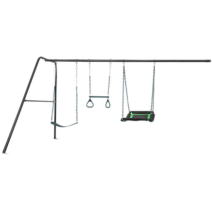 Transform your backyard or upgrade your current setup with this standalone metal swing set, a durable and versatile addition to any Aussie family home. Designed for easy integration, this durable frame can be added to existing structures or cubby houses and is compatible with the Pallas Play Tower. Add various swing stations such as belt swing, trapeze or nest swing to create your own custom setup. Tested to Australian Safety Standards, the galvanised steel frame is rust free and weather resistant. On top of that, the frame is reinforced to create a more rigid and stable swing set, allowing your family to enjoy your new play centre with peace of mind.