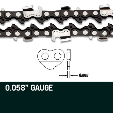 The Baumr-AG 22" Chainsaw Chain has a 0.058" gauge and 86 drive links. Its patented Tru-Sharp technology offers prolonged sharpness, and its anti-jam roll links and low resistance bevel tie-strap act in unison to minimise kickback.