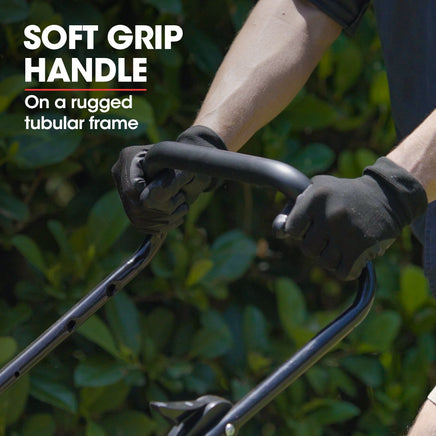 Mowing won't be a chore with oversized wheels to glide over the terrain and the lightweight grass catcher.