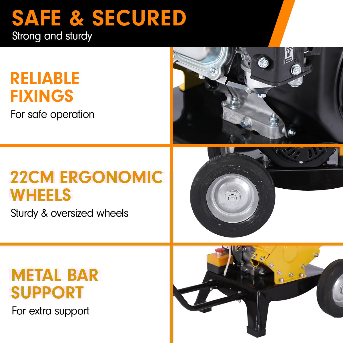 The rugged steel hopper stands at 112cm high, so yard waste can be dropped in with minimal effort. Compost your small trees, leaves, branches, crop straw and farming feed with this wood chipper.