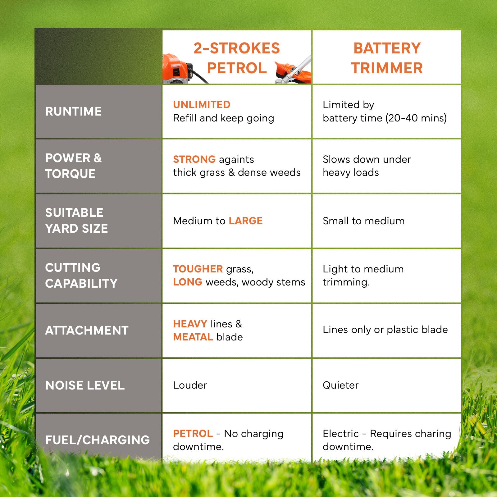 - Efficient 26cc 2-stroke petrol engine suitable for regular grass and weed trimming
