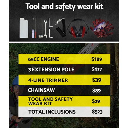 The three extension poles are all made of 26mm quality commercial alloy and when connected fully with the reliable quick spring connect, can reach up to a height of 4.3m. In practical terms, its best to have an extra hand dealing with the increased weight beyond 3m. Not least, the GIANTZ Chainsaw/Hedge Trimmer comes loaded with a bonus accessory kit, featuring gloves, earmuffs, mini toolkit and fuel mixer.