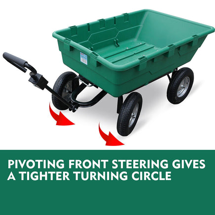 The Dump Cart features ultra-durable 15" pneumatic tyres that act to protect fragile lawns and roll over all kinds of terrain with ease. Maneuvering the cart is made even easier thanks to the pivoting front steering that produces a tight and uniform turning circle. It's operated with a soft-grip 80 cm steel handle attached to its tough powder coated steel frame. This versatile cart is also a handy piece of equipment for all kinds of outings and events. Use it for carting around sporting equipment at the kids sports game or moving all the food, drink and accessories for your next picnic.