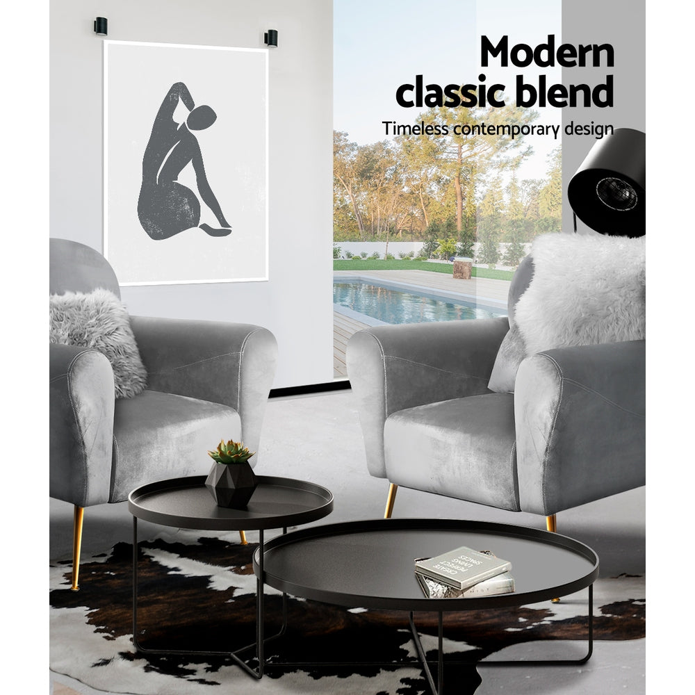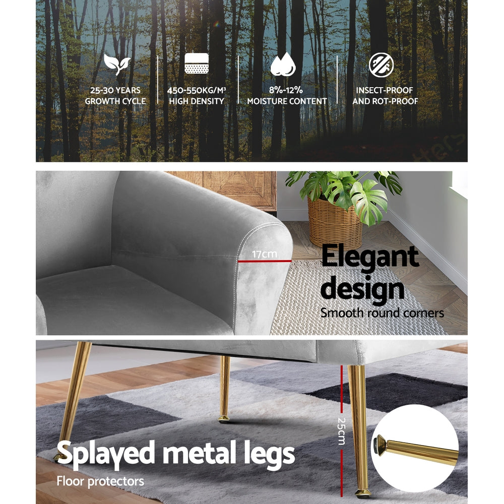Artiss Caroline armchair offers a wide and welcoming seat with comfortable rolled armrests for you to relax. It is ideal for every corner of your space where you want to add soft and comfy touches. You can style it in your living room, lounge room, or reading room. Crafted with great attention to details, this armchair feature solid wood construction with high resilience foam. It is quite sturdy and will withstand the test of time. Our Caroline armchair is upholstered in soft velvet fabric that epitomises luxury with its smooth and shiny appearance and adds a cosy and relaxing feel to your space. Plus, the splayed golden metal legs with floor protectors will offer optimum stability and protection to your floors and add a luxurious charm to your space with its gorgeous presence.