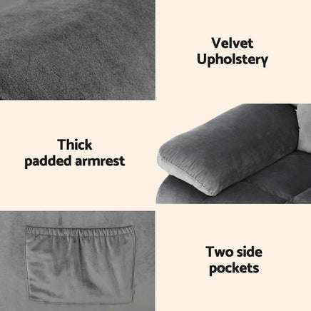 Sit back and relax with the Artiss Recliner Chair. With its 8-point massage and 2-point heating function, you can get soothing massages with the recliner at all the right places. Upholstered in fine-quality velvet fabric, the recliner is an oasis for plush comfort. High-resilience sponge padding lets you float away on a cloud of comfort and relaxation. The sturdy steel base allows a weight capacity of up to 150kg. The contoured backrest provides good support with multi-angle tilt adjustment to suit different sitting positions for your favourite activities. An adjustable footrest lets you put your feet up in style. You will also enjoy the ultra-wide armrests and two large side pockets to keep all your lounging essentials close at hand. Not least, it comes with a handy remote control to turn on everything at your fingertips.